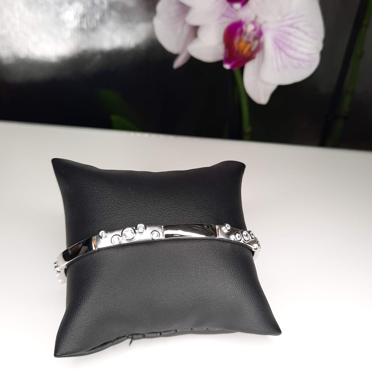 Hopeinen rannekoru jossa joka toinen pala kiiltävä ja joka toinen mattapintainen zirkoneilla.